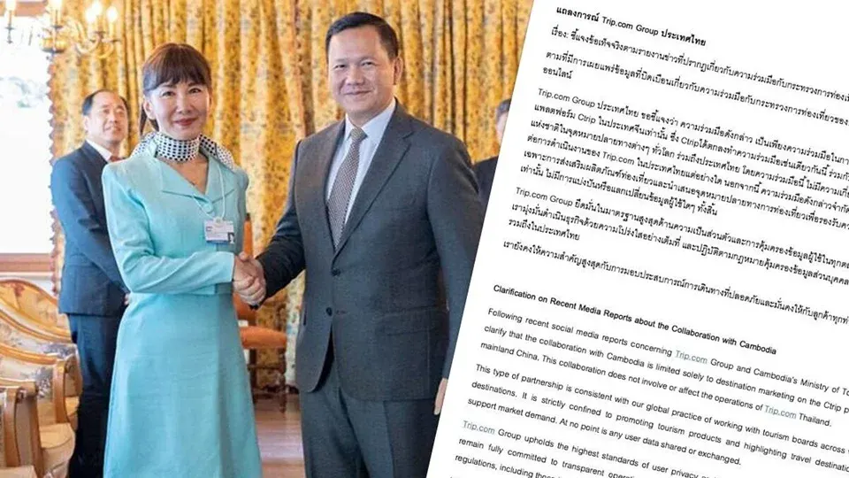 Trip.com งานเข้า! รีบออกแถลงการณ์..หลังมีข่าวลือขายข้อมูลให้ "กัมพูชา" เรียกว่าโซเชียลระอุเลยทีเดียวหลังมีภาพจับมือกับ "ฮุน มาเนต" นายกฯ กัมพูชา จนเว็บดังรีบยกเลิกความร่วมมือท่องเที่ยวกัมพูชาทันที