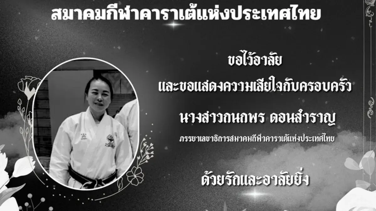 สมาคมกีฬาคาราเต้แห่งประเทศไทยได้แจ้งข่าวการสูญเสีย คุณกนกพร ดอนสำราญ วัย 38 ปี หนึ่งในทีมงานผู้ฝึกสอนคนสำคัญของทีมชาติไทย โดยเหตุการณ์เกิดขึ้นเมื่อวันที่ 16 ธันวาคม 2568 เมื่อรถยนต์ที่โค้ชกนกพรกำลังใช้เดินทางกลับภูมิลำเนาที่จังหวัดเลย ประสบอุบัติเหตุพุ่งชนท้ายรถบรรทุกอ้อยในพื้นที่อำเภอวังสะพุง เป็นเหตุให้โค้ชผู้มากความสามารถต้องเสียชีวิตลงในที่เกิดเหตุ ท่ามกลางความโศกเศร้าของครอบครัวและคนในวงการกีฬา