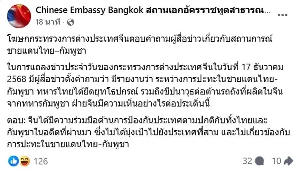 ล่าสุด เมื่อวันที่ 12 ธ.ค.68 ที่ผ่านมา ทางเพจเฟซบุ๊ค "เอกอัครราชทูตสาธารณรัฐประชาชนจีนประจำประเทศไทย" ก็รีบออกมาโพสต์คำกล่าวของทางโฆษกกระทรวงการต่างประเทศจีน เพื่อคลายความสงสัยของประชาชนไทยเกี่ยวกับอาวุธสมัยใหม่ที่กองทัพไทยยึดได้จากทางฝั่งกัมพูชา ซึ่งงานนี้ก็ได้ตอบคำถามผู้สื่อข่าวเกี่ยวกับประเด็นสถานการณ์ความขัดแย้งตามแนวชายแดนไทย–กัมพูชา โดยเป็นการแถลงข่าวประจำวันของกระทรวงการต่างประเทศจีน ในวันที่ 17 ธันวาคม 2568 ที่ผ่านมา