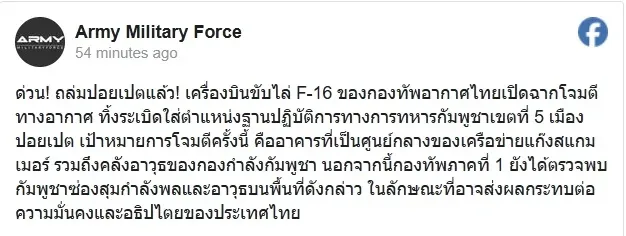 บอกเลยงานนี้สมใจใครหลายๆ คนแล้ว เมื่อวันที่ 18 ธ.ค.68 เวลาประมาณ 11.54 น. ที่ผ่านมา ทางเพจเฟซบุ๊ค Army Military Force ได้โพสต์คลิปวีดีโอ เผยให้เห็นการทิ้งระเบิดในพื้นที่เมืองปอยเปต จ.บันทายมีชัย ของกัมพูชา ซึ่งอยู่ตรงข้ามกับ อ.อรัญประเทศ จ.สระแก้ว พร้อมกันนี้ก็ได้ระบุข้อความด้วยว่า “ด่วน! ถล่มปอยเปตแล้ว! เมื่อสักครู่ที่ผ่านมา - ทหารไทยเปิดฉากถล่มฐานทหารเขต 5 พิกัดเมืองปอยเปต หลังพบทหารกัมพูชาซ่องสุมกำลังพลอาวุธรุกรานประเทศไทย”