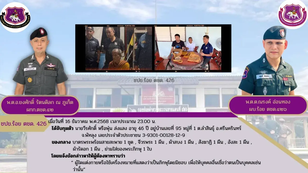 จากการตรวจสอบ เจ้าหน้าที่พบชายคนดังกล่าวอยู่ในชุดผ้าเหลือง ทราบชื่อภายหลังคือ นายวีรศักดิ์ หรือ “พุ๋น” ส่งแสง อายุ 46 ปี ภูมิลำเนาอยู่หมู่ 1 ตำบลลำสินธุ์ อำเภอศรีนครินทร์ จังหวัดพัทลุง เมื่อขอตรวจสอบเอกสารยืนยันการอุปสมบท กลับไม่พบใบสุทธิหรือหลักฐานใด ๆ แสดงความเป็นพระภิกษุ เจ้าหน้าที่จึงควบคุมตัวมาสอบสวน พร้อมตรวจยึดของกลางเป็นเครื่องแต่งกายและอุปกรณ์พระภิกษุครบชุด ไม่ว่าจะเป็นบาตรพระ จีวร ผ้าสบง สังฆาฏิ อังสะ ผ้ารัดอก และย่ามพระ