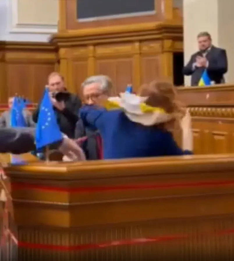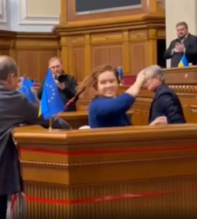 รัฐสภายูเครนตกอยู่ในความโกลาหล หลังจากสมาชิกรัฐสภาหญิง "มาเรียนา เบซูห์ลา" เข้าขัดขวางแท่นปราศรัย และ มีการกระทบกระทั่งกับสมาชิกรัฐสภาคนอื่น