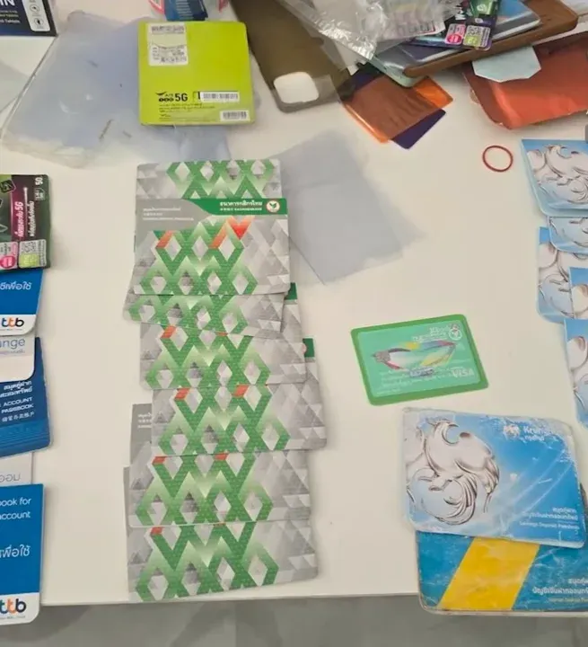 แถมยังเจอบัญชีธนาคารกับบัตร ATM อีกประมาณ 10 ใบ ซึ่งก็คือ บัญชีม้า ชัดๆ เอาไว้รับเงินจากเหยื่อแล้วโอนต่อ ล้างเส้นทางเงิน