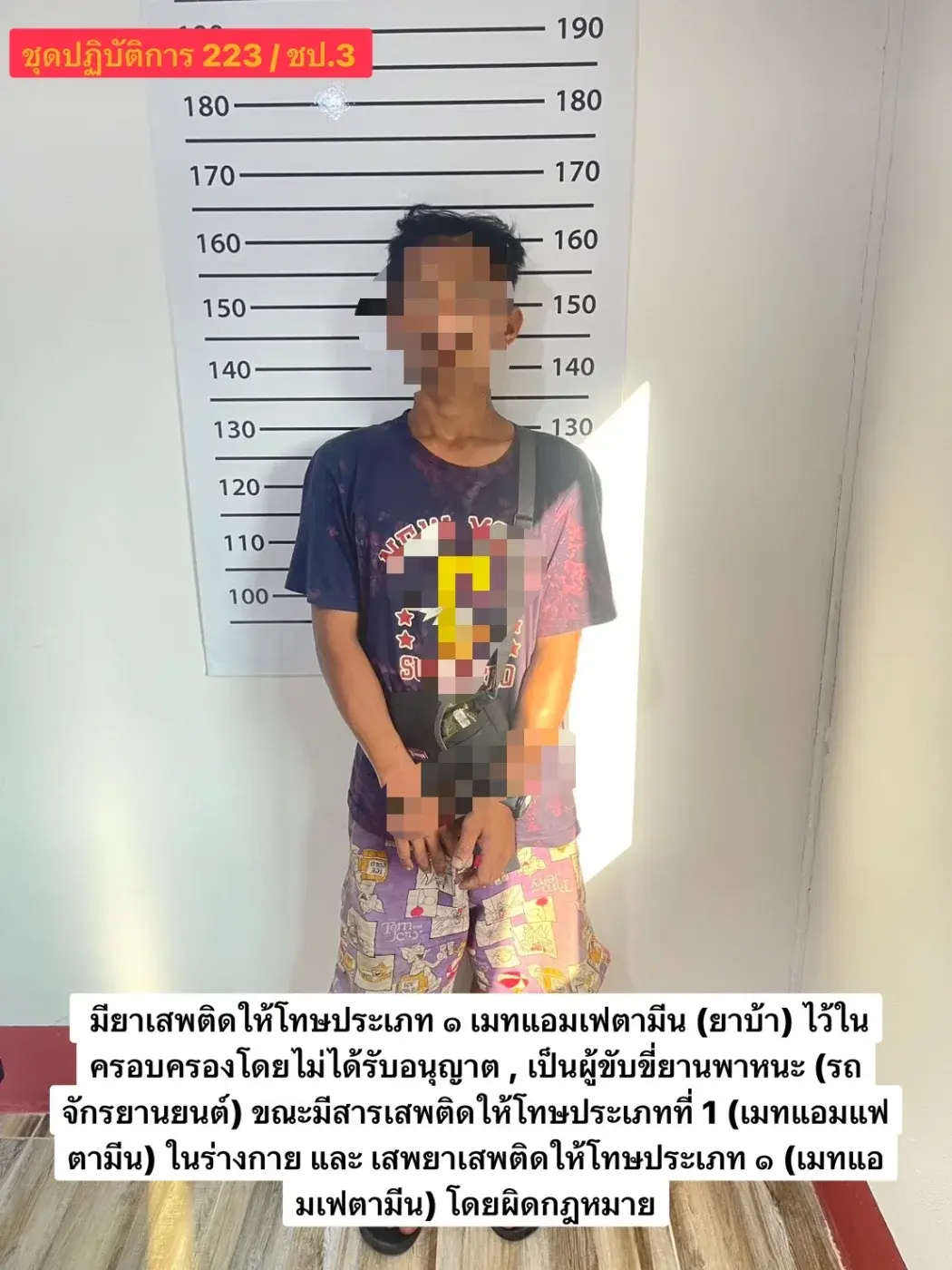 โดยระหว่างตำรวจสายตรวจรถจักรยานยนต์ เข้าตรวจสอบอุบัติเหตุรถจักรยานยนต์ชนกัน บริเวณปากซอยพัฒนา 1 ถนนราชดำเนิน ต.ในเมือง อ.เมืองนครศรีธรรมราช เพื่ออำนวยความสะดวกด้านจราจร ระหว่างรอพนักงานสอบสวนเข้าตรวจสอบพื้นที่ พบว่ามีชายอายุ 25 – 30 ปี เป็นคนงานส่งน้ำดื่มร้านค้าแห่งหนึ่ง ขี่รถจักรยานยนต์พ่วงข้าง มีน้ำดื่มเต็มคัน จอดอยู่ริมถนนดูอุบัติเหตุ ในลักษณะกีดขวางทางจราจร จึงขอความร่วมมือให้ขยับรถ แต่ระหว่างนั้นตำรวจสังเกตุพฤติกรรมชายคนดังกล่าวท่าท่าพิรุธ จึงแสดงตัวขอตรวจค้น แต่ชายต้องสงสัยดังกล่าวพยายามขี่รถจักรยานยนต์ออกจากที่เกิดเหตุ แต่สุดท้ายไม่รอด ถูกตรวจค้นและพบว่าในมือกำยาบ้าเม็ดสีส้ม มีตัวอักษร WY บรรจุถุงพลาสติกใสจำนวน 2 เม็ด จึงทำการจับกุมสอบสวนทราบชื่อนายเอกชัย อายุ 29 ปี บ้านอยู่ ต.คลัง อ.เมือง ให้การรับสารภาพว่า ยาบ้าเป็นของตนเอง โดยบางช่วงบางตอนนายเอกชัย ผู้ต้องหา ถึงกับเสียงสั่นเครือและพยายามขอโทษ อ้อนวอน ขอร้อง และขอโอกาสกับตำรวจ พร้อมกับอ้างว่า มีลูกเล็กที่ต้องดูแล ก่อนจะนำตัวนายเอกชัย พร้อมของกลางยาบ้า สอบสวนขยายายผล ตรวจสอบปัสสาวะ พบมีสารเสพติด ส่งพนักงานสอบสน สภ.เมือง ดำเนินคดีตามกฎหมาย ข้อหาเสพ และมียาเสพติดไว้ในครอบครองโดยผิดกฎหมาย