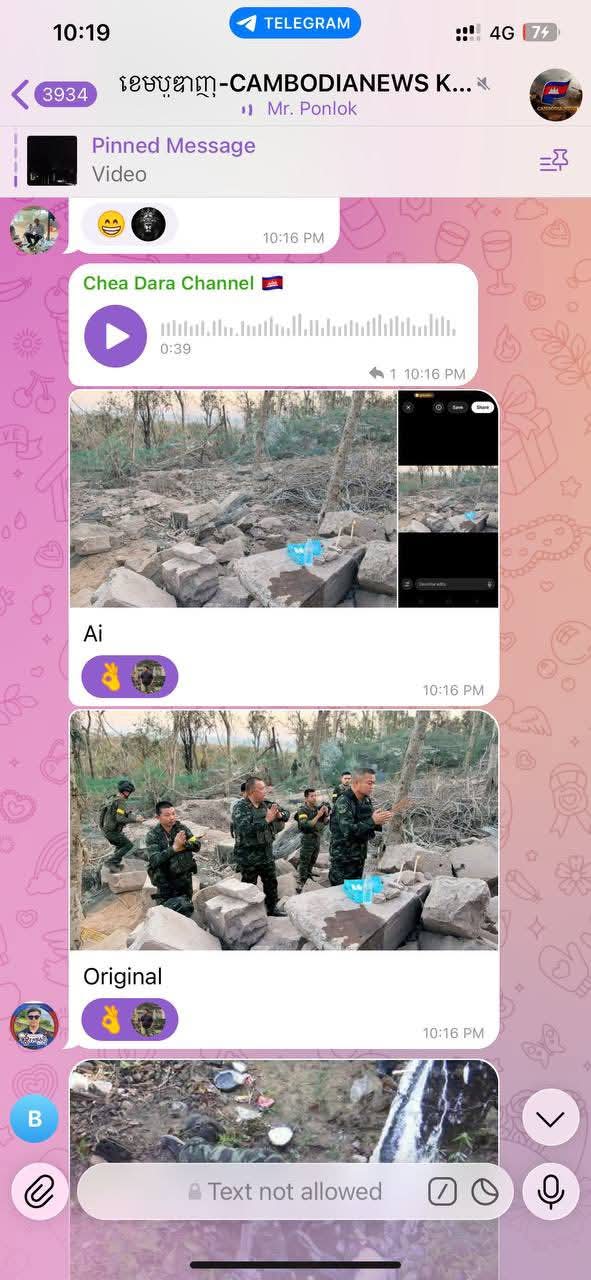 ฝั่ง Telegram ก็ไม่แพ้กัน IO เขมรโพสต์ภาพปลอมชุดเดิม พร้อมข้อความให้เชื่อรัฐบาล เชื่อผู้นำ เชื่อกองทัพ ห้ามเชื่อภาพจริงจากฝั่งไทย อ้างว่าไทยกำลังปล่อยข่าวปลอม ทั้งที่ต้นทางข่าวปลอมคือใคร ทุกคนก็น่าจะพอดูออก