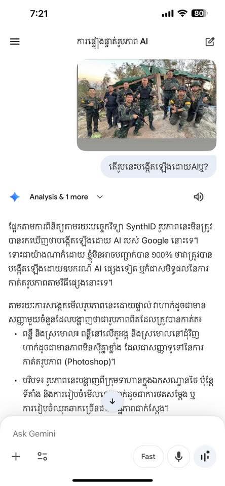 ที่พีคกว่านั้นคือ เพจ IO ยังเอาแอป Fresh AI ของสื่อรัฐบาลกัมพูชามาใช้ยืนยันข่าวปลอมอีกขั้น บอกว่าภาพจริงจากฝั่งไทยนั่นแหละเป็น AI ทั้งหมด ทั้งที่ของตัวเองคือ AI ล้วนๆ เหมือนหลอกคนให้เชื่อว่า อย่าเชื่อสิ่งที่เห็น ให้เชื่อสิ่งที่รัฐบอก