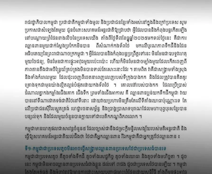 ทางกัมพูชายืนยันเสียงแข็งว่า ตัวเองเป็นประเทศเล็ก ไม่มีศักยภาพ ไม่มีเจตนา และไม่มีทางเป็นฝ่ายรุกรานไทยก่อน พร้อมระบุว่าตั้งแต่วันที่ 7 ธ.ค. 68 เป็นต้นมา กัมพูชากลับเป็นฝ่ายที่ถูกโจมตี โดยอ้างว่ากองทัพไทยมีการเคลื่อนกำลังทั้งทางบก อากาศ และทะเล ตลอดแนวชายแดนยาวกว่า 800 กิโลเมตร