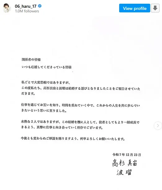 ทั้งสองได้เริ่มต้นข้อความด้วยคำว่า "ถึงทุกท่านที่เกี่ยวข้อง และ ทุกท่านที่คอยสนับสนุนพวกเราเสมอมา" ก่อนจะกล่าวว่า "ขออภัยเป็นอย่างยิ่ง ที่ต้องรบกวนด้วยเรื่องส่วนตัว แต่พวกเรา "มาซาฮิโระ ทาคาสุงิ" และ "ฮารุ" ขอแจ้งให้ทราบว่า "เราทั้งสองได้ตัดสินใจเข้าพิธีสมรสกันแล้ว!!"