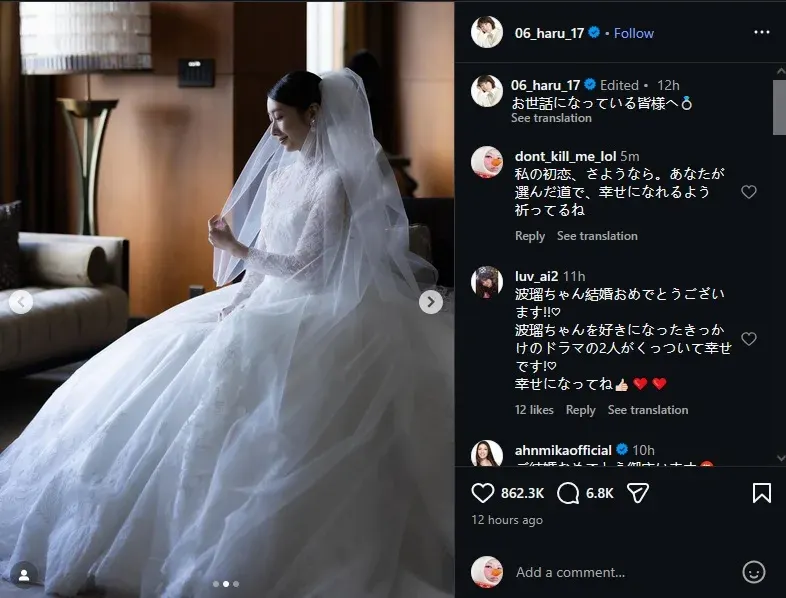 ในโพสต์ของ "ฮารุ" ยังได้มีการเผยแพร่ภาพในชุดเจ้าสาว รวมถึงภาพในชุดกิโมโนแต่งงานแบบญี่ปุ่น [ชิโรมุกุ] อีกด้วย