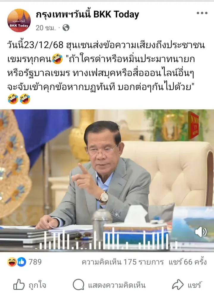 สวัสดีชาว postjung กันทุกคน วันนี้มีข่าวจากฝั่งกัมพูชามาฝาก ที่กำลังเป็นประเด็นร้อนที่สื่อในประเทศเขาเองหยิบมารายงานกันต่อเนื่อง หลังมีการ แฉข้อมูลและคลิปเสียงที่อ้างว่าเป็นเสียงของสมเด็จฯ ฮุน เซน หลุดออกมาในโลกออนไลน์ ว่าด้วยเรื่องการควบคุมสถานการณ์ภายในประเทศในช่วงที่บรรยากาศความมั่นคงตึงเครียด