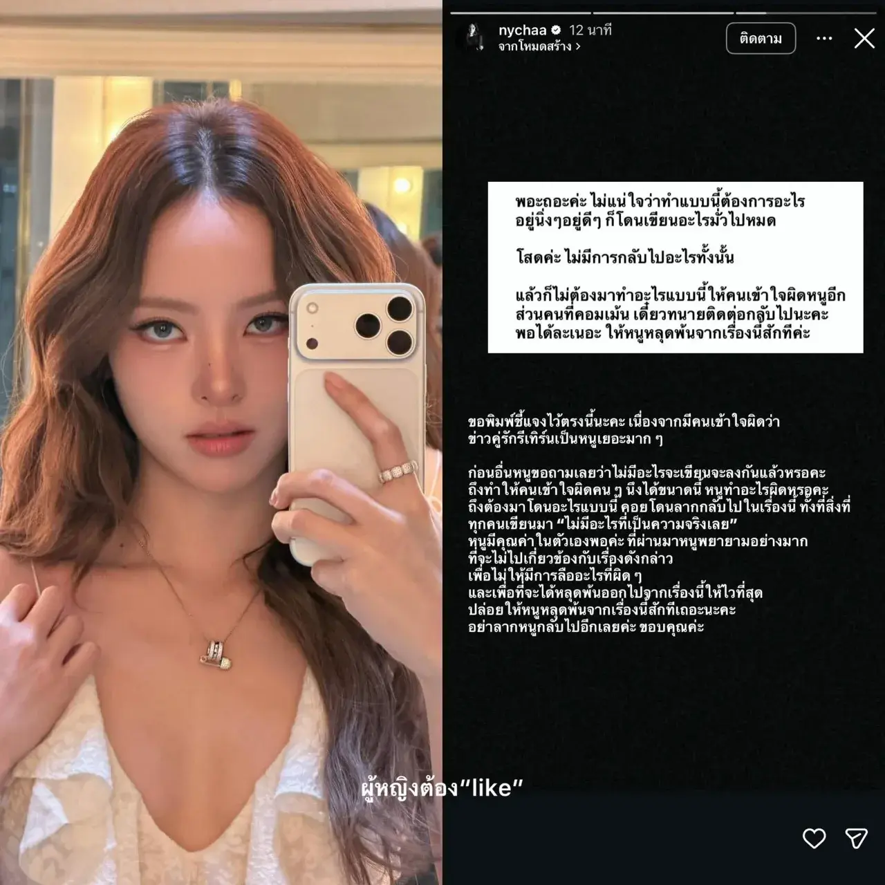 ข่าวคู่รักรีเทิร์นเป็นหนูเยอะมาก ๆ ก่อนอื่นหนูขอถามเลยว่าไม่มีอะไรจะเขียนจะลงกันแล้วหรอคะ ถึงทำให้คนเข้าใจผิดคน ๆ นึงได้ขนาดนี้ หนูทำอะไรผิดหรอคะ ถึงต้องมาโดนอะไรแบบนี้ คอยโดนลากกลับไปในเรื่องนี้ ทั้งที่สิ่งที่ทุกคนเขียนมา "ไม่มีอะไรที่เป็นความจริงเลย" หนูมีคุณค่าในตัวเองพอค่ะ ที่ผ่านมาหนูพยายามอย่างมากที่จะไม่ไปเกี่ยวข้องกับเรื่องดังกล่าว