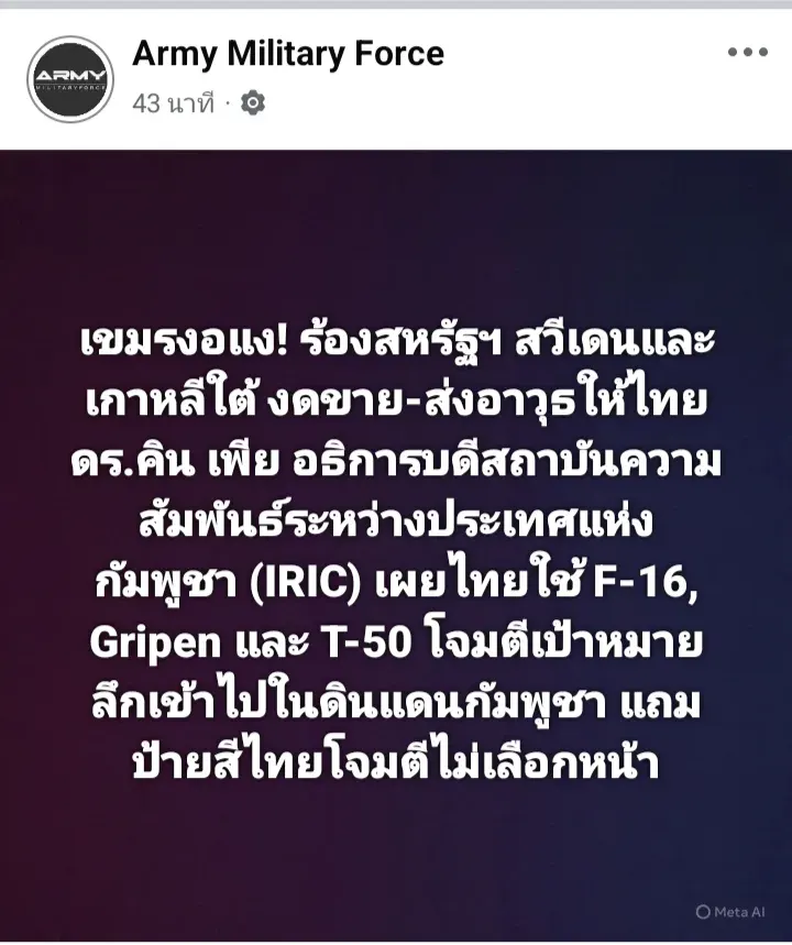 โดย ดร.คิน เพีย อธิการบดีสถาบันความสัมพันธ์ระหว่างประเทศกัมพูชา (IRIC) อ้างว่าไทยใช้เครื่องบินรบ F-16 Gripen และ T-50