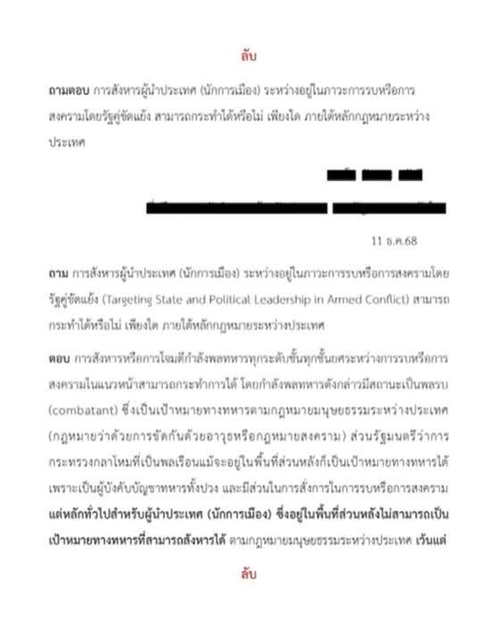 การสังหารผู้นำประเทศคู่ขัดแย้งเพื่อจบสงครามนั้น ทำได้หรือไม่ เนื้อหาในเอกสารระบุว่า โดยหลักการแล้วผู้นำที่เป็นนักการเมืองและอยู่แนวหลัง จะไม่ใช่เป้าหมายในการโจมตีทางทหาร แต่จุดที่ทำให้ผู้นำฝั่งกัมพูชาอย่าง ฮุนเซนและฮุนมาเนตต้องนั่งไม่ติด คือข้อความส่วนท้ายที่ระบุเงื่อนไขว่า "เว้นแต่..." ซึ่งมีการตีความกันว่า