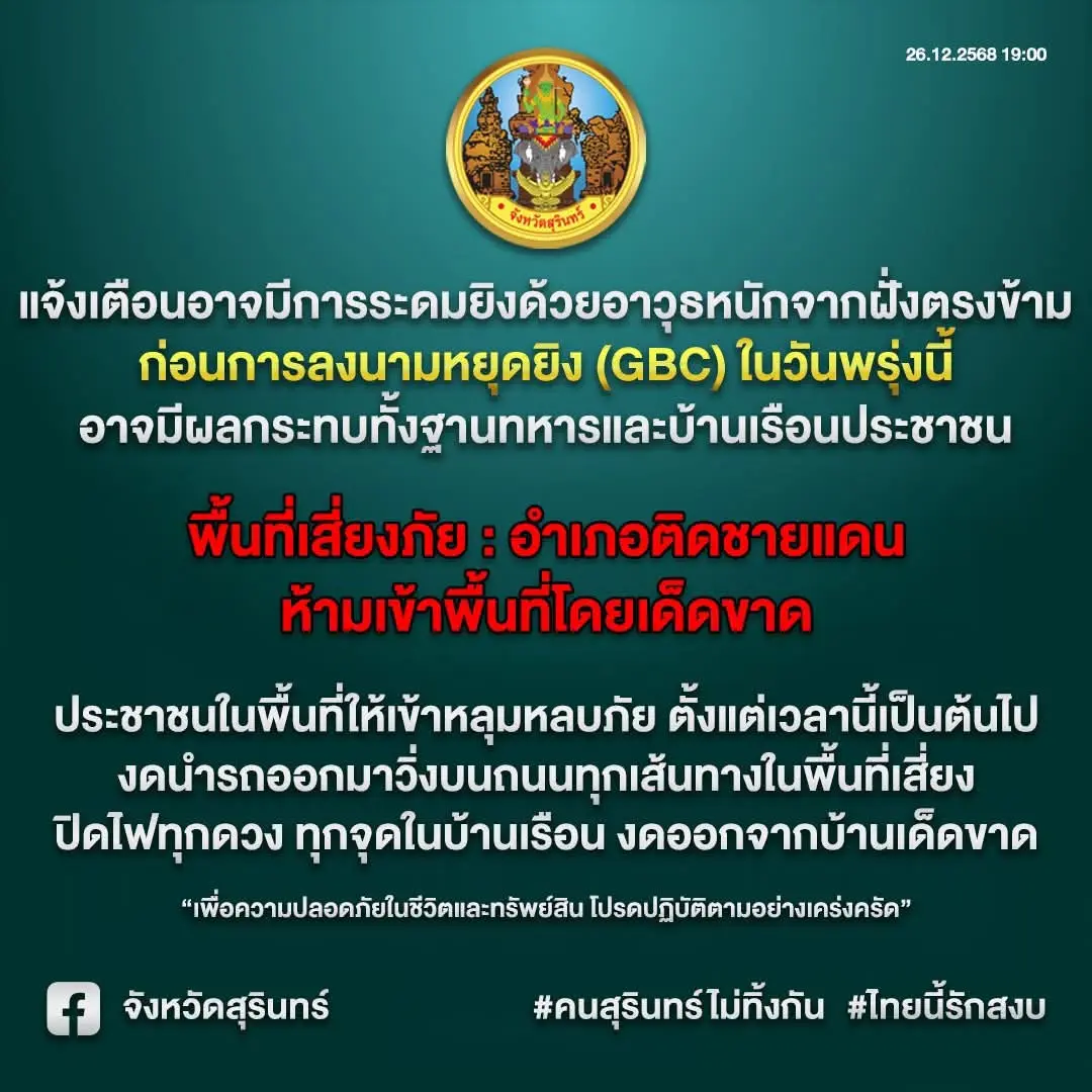 ⚠️ สถานการณ์: มีการแจ้งเตือนเกี่ยวกับการระดมยิงด้วยอาวุธหนักจากฝั่งตรงข้าม ก่อนการลงนามหยุดยิง (GBC) ในวันพรุ่งนี้ ซึ่งอาจส่งผลกระทบต่อฐานทหารและบ้านเรือนประชาชน