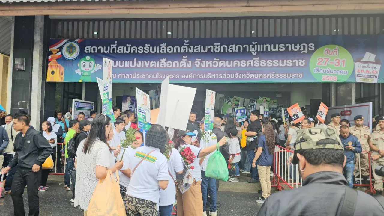 วันที่ 26 ธันวาคม 2568 ผู้สื่อข่าว จ.นครศรีธรรมราช รายงานข่าวบรรยากาศการรับสมัคร สส.นครศรีธรรมราช ทั้ง 9 เขตเลือกตั้ง ที่ห้องประชุมโรงละคร อบจ.นครศรีธรรมราช มีบรรดาผู้สมัคร สส.จากพรรคการเมืองต่างๆหลายพรรคได้ลุยสายฝนที่ตกลงมาอย่างหนักตลอดเวลาตั้งแต่เช้า เดินทางไปลงชื่อก่อนเวลา08.30น.อย่างคึกคัก ท่ามกลางกองเชียร์ที่ตามมาถือป้ายและพวงมาลัยเชียร์ผู้สมัครของตนเองอย่างคึกคัก ท่ามกลางสายฝนตกปรอยปรายตลอดเวลา แต่ไม่มีใครย่อท้อต่างถือร่มกางฝนสู้ตลอดเวลา โดยมีแกนนำพรรคการเมืองหลายคนเช่นนายชัยชนะ เดชเดโช รอง หน.พรรคประชาธิปัตย์ ภาคใต้ ,นายวิทยา แก้วภราดัย แกนนำพรรครวมไทยสร้างชาติ ไปร่วมเชียร์ผู้สมัครของตัวเองอย่างคึกคักเช่นกัน มีนายสุวัฒน์ แจ้งสุข รอง ผวจ.นครศรีธรรมราช เป็นประธานการรับสมัคร,และพ.ตงอ.สุทัศน์ ชาญสวัสดิ์ รอง ผบก.ภ.นครศรีธรรมราชและหน.ส่วนร่วมสังเกตคุการณ์