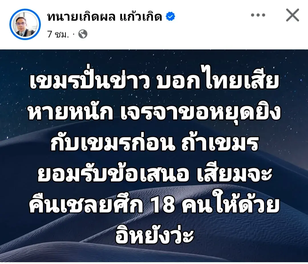 สำหรับเมื่อวาน ได้มีสถานการณ์ชายแดนไทยกัมพูชาเกิดขึ้น ซึ่งเป็นข่าวใหญ่ก็คือรัฐมนตรีกลาโหมของไทยและรัฐมนตรีกลาโหม ของกัมพูชาได้มีการลงนามยึดจริงทั้งสองฝ่ายและให้มีการเฝ้าระวังภายใน 72 ชั่วโมงทั้งนี้ทั้งแม้จะมีการหยุดยิงทหารไทยก็มีการเฝ้าระวังตามจุดต่างๆเพื่อป้องกันความเคลื่อนไหวของฝ่ายกัมพูชาเนื่องจากกัมพูชาไม่สามารถเชื่อถือได้ชอบลอบกัดภัยอยู่เป็นประจำ ล่าสุดนี้เองทางเพจ Facebook ของทนายเกิดผลก็ได้มีการออกมาโพสต์ข้อความระบุว่าเขมรปั่นข่าว บอกไทยเสียหายหนัก เจรจาขอหยุดยิงกับเขมรก่อน ถ้าเขมรยอมรับข้อเสนอ เสียมจะคืนเชลยศึก 18 คนให้ด้วย