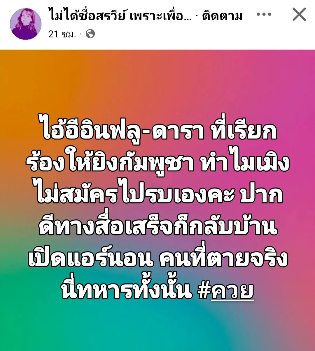 อินฟลู-ดารา ที่เรียกร้องให้ยิงกัมพูชา ทำไมไม่สมัครไปรบกับกัมพูชาเองปากดีผ่านสื่อ พูดเสร็จ ก็กลับบ้านเปิดแอร์นอนคนที่เสียชีวิตจริงคือพี่ทหารตามแนวชายแดน