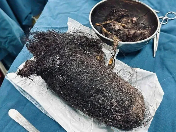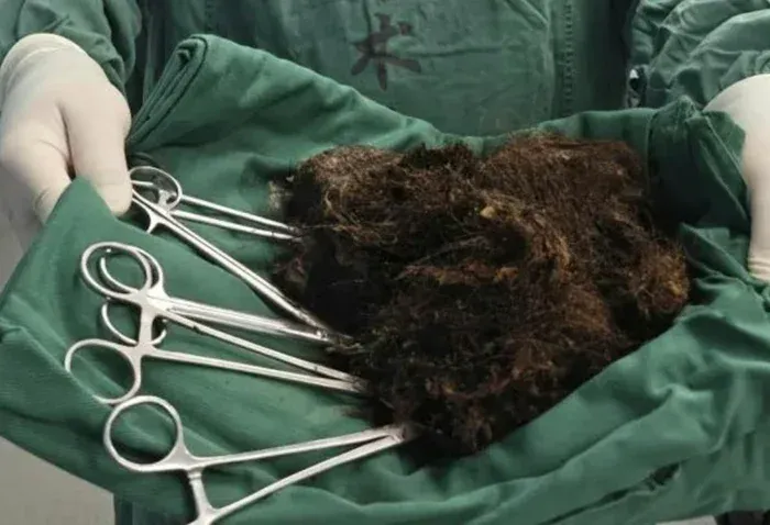 ตามรายงานของสื่อท้องถิ่น ผู้ป่วยหญิงรายนี้มีอาการแน่นท้อง ย่อยอาหารลำบาก และ ปวดท้องต่อเนื่องมาหลายเดือน เมื่อเข้ารับการตรวจที่โรงพยาบาล แพทย์พบว่ามีวัตถุแปลกปลอมขนาดใหญ่และแข็งคล้ายก้อนหิน อยู่ในกระเพาะอาหารของเธอ การส่องกล้องพบว่าวัตถุดังกล่าวถูกปกคลุมด้วยเส้นผมจำนวนมาก จนรวมตัวกันเป็นก้อนแข็งแน่น
