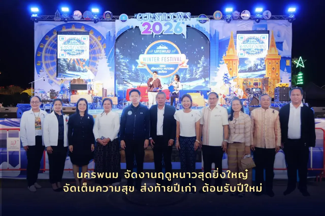 นครพนม จัดใหญ่ ! เปิดตัว Nakhonphanom Winter Festival 2026 ปรากฏการณ์ถนนเรืองแสง–อุโมงค์ไฟยาว 500 เมตร โดยว่าที่พันตรี อดิศักดิ์ น้อยสุวรรณ ผู้ว่าราชการจังหวัดนครพนม รองผู้ว่าราชการจังหวัดนครพนม นายกองค์การบริหารส่วนจังหวัดนครพนม นายกเทศมนตรีเมืองนครพนม นางสาวนงนุช สีทาน้อย ท่องเที่ยวและกีฬาจังหวัดนครพนม หัวหน้าส่วนราชการ องค์กรภาคเอกชน ร่วมกัน kick off เปิดกิจกรรมงาน Nakhonphanom Winter Festival 2026 ตอน เคียงดาว หนาวลม ชมโขง โดยมีหัวหน้าส่วนราชการ หน่วยงานภาครัฐ เอกชน สื่อมวลชน ประชาชนและนักท่องเที่ยว