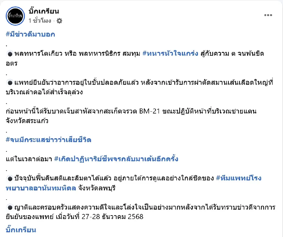 "พลทหารโตเกียว" หรือ "พลทหารนิธิกร สมทุม" อายุ 21 ปี ได้รับบาดเจ็บสาหัสจากสะเก็ดระเบิด BM-21 ขณะปฏิบัติหน้าที่ปกป้องอธิปไตยของประเทศไทยที่บ้านหนองจาน ล่าสุดมีข่าวดีจากเพจบิ๊กเกรียนว่าอาการของเขาอยู่ในขั้นปลอดภัยแล้ว หลังจากเข้ารับการผ่าตัดสมานเส้นเลือดใหญ่ที่ลำคอสำเร็จ ก่อนหน้านี้มีข่าวว่าเขาอาจเสียชีวิต แต่ปัจจุบันเขาฟื้นคืนสติและอยู่ภายใต้การดูแลของทีมแพทย์ที่โรงพยาบาลอานันทมหิดล จังหวัดลพบุรี ครอบครัวและญาติรู้สึกดีใจมากที่ได้รับข่าวดีนี้เมื่อวันที่ 27-28 ธันวาคม 2568