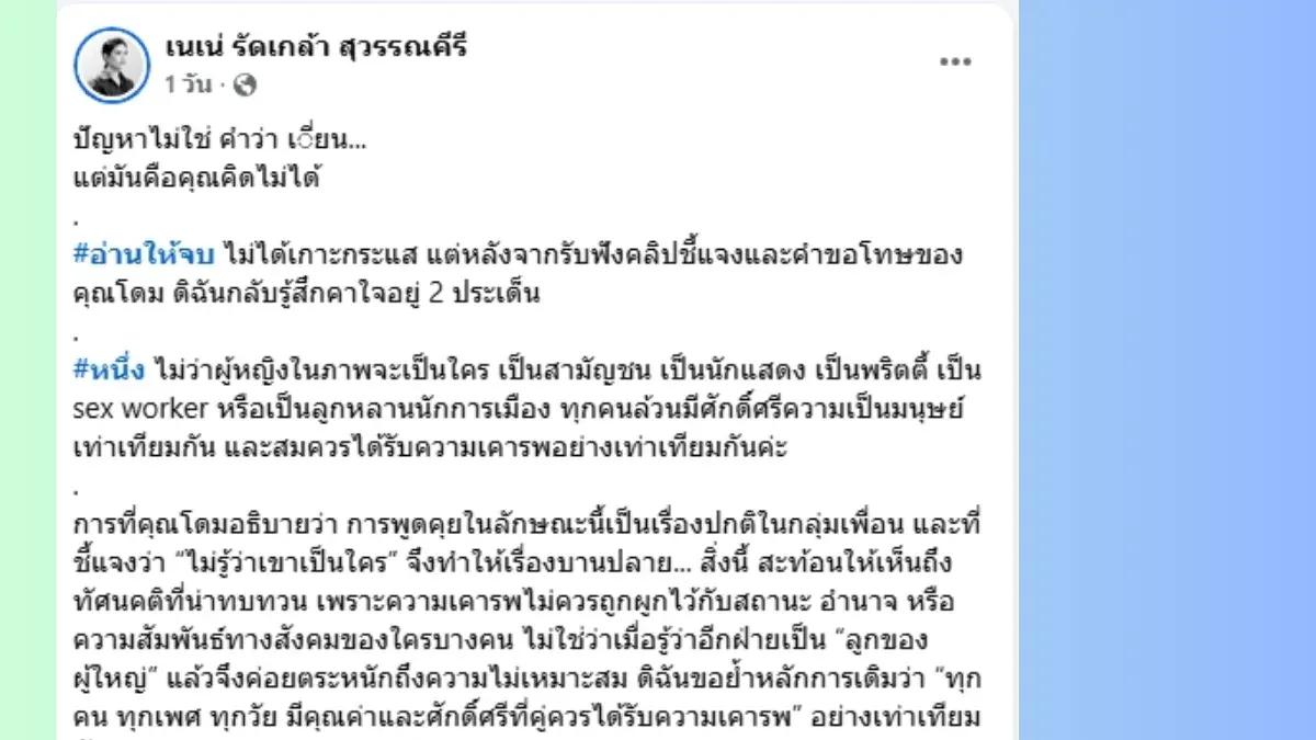 ประเด็นร้อนส่งท้ายปีที่ถูกพูดถึงอย่างกว้างขวาง เมื่อการแสดงความคิดเห็นบนโลกโซเชียลลุกลามกลายเป็นบทสนทนาเรื่องสิทธิและศักดิ์ศรีความเป็นมนุษย์ กรณีของนักร้องดังยุค 90 ที่ตกเป็นเป้าวิจารณ์จากการคอมเมนต์ในลักษณะคุกคามทางเพศ แม้จะมีการออกมาขอโทษโดยอ้างเหตุแห่งอาการมึนเมา แต่คำชี้แจงดังกล่าวนำมาสู่การตั้งคำถามที่ลึกซึ้งกว่าเดิมจากฟากฝั่งนักการเมืองหญิงที่มองว่าเรื่องนี้ไม่ใช่แค่เรื่องส่วนตัว
