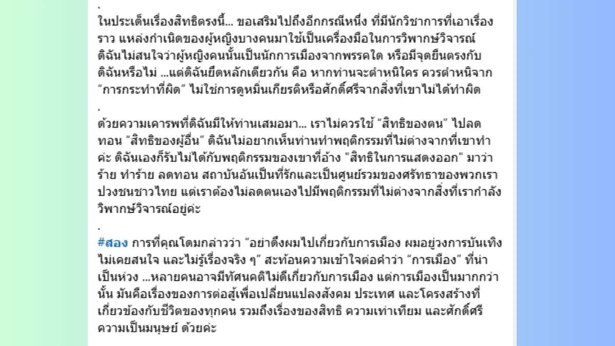 ประการที่สองคือมุมมองที่มีต่อ "การเมือง" โดยเธอตอบโต้กรณีที่ฝ่ายชายระบุว่าไม่อยากให้โยงเข้าเรื่องการเมืองว่า การเมืองแท้จริงแล้วคือเรื่องของสิทธิ ความเท่าเทียม และศักดิ์ศรีที่เกี่ยวข้องกับทุกคนในสังคม ในฐานะที่ทั้งนักร้องและนักการเมืองต่างเป็นบุคคลสาธารณะที่มีอิทธิพลต่อความคิดของเยาวชน การกระทำใดๆ จึงมาพร้อมกับความรับผิดชอบที่หลีกเลี่ยงไม่ได้ตามหลักการ "อำนาจที่ยิ่งใหญ่มาพร้อมความรับผิดชอบที่ใหญ่ยิ่ง"