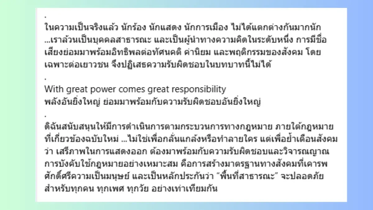 บทสรุปของเรื่องนี้ไม่ได้จบลงเพียงแค่คำขอโทษ แต่เป็นการเรียกร้องให้สังคมใช้กฎหมายฉบับใหม่ที่เกี่ยวข้องกับการคุกคามทางเพศมาเป็นบรรทัดฐานในการเอาผิด เพื่อสร้างมาตรฐานใหม่ว่าพื้นที่สาธารณะต้องปลอดภัยสำหรับทุกคน และเป็นการย้ำเตือนว่า "เสรีภาพในการพูด" ต้องเดินคู่ไปกับ "ความรับผิดชอบต่อสังคม" เสมอ เพื่อไม่ให้คำว่ารู้เท่าไม่ถึงการณ์ถูกนำมาใช้เป็นเกราะป้องกันความผิดซ้ำแล้วซ้ำเล่า