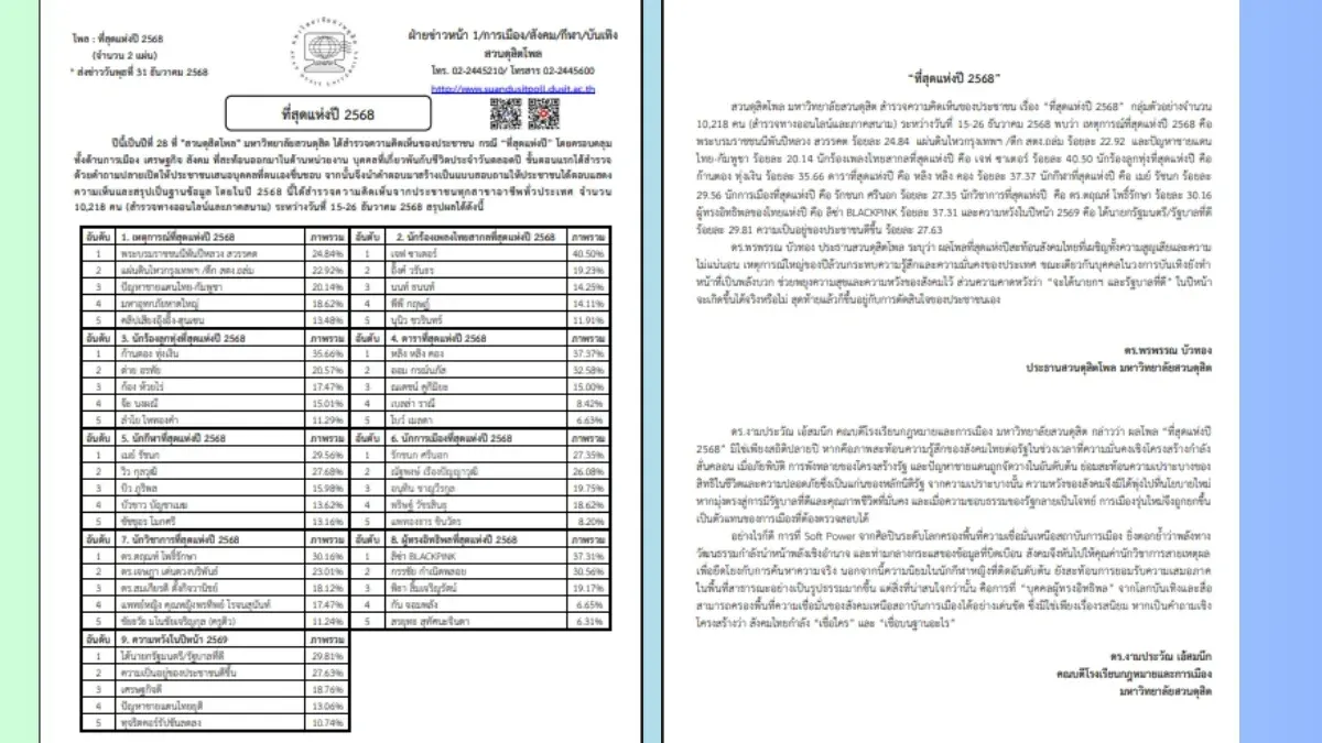 สวนดุสิตโพล มหาวิทยาลัยสวนดุสิต ได้เปิดเผยผลสำรวจความคิดเห็นจากประชาชนทั่วประเทศกว่า 10,218 คน ในหัวข้อ "ผู้ทรงอิทธิพลที่สุดแห่งปี 2568" ซึ่งผลการสำรวจชี้ชัดว่า ลิซ่า BLACKPINK หรือ ลลิษา มโนบาล ครองอันดับ 1 ด้วยคะแนนสูงถึง 37.31% โดยประชาชนมองว่าเธอคือตัวแทนของความสำเร็จที่สร้างชื่อเสียงให้ประเทศไทยในระดับสากล และเป็นแรงบันดาลใจสำคัญให้แก่คนรุ่นใหม่
