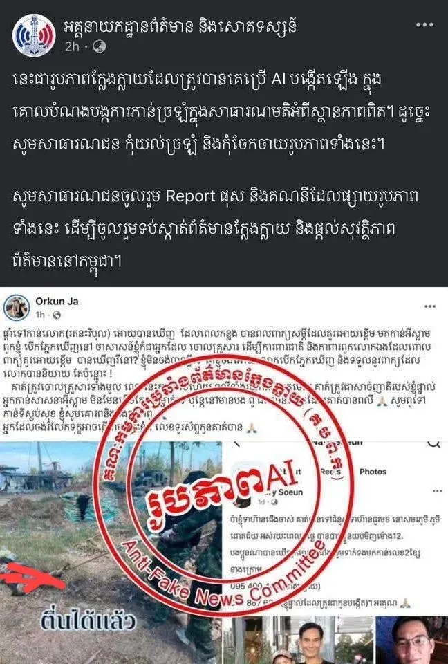 ทางการกัมพูชา โดยรัฐบาลฮุนเซน ออกมาโพสต์เฟซบุ๊กว่า ภาพดังกล่าวเป็นภาพ AI ขอให้ประชาชนอย่าเชื่อ และเตือนว่าคนที่เผยแพร่อาจถูกดำเนินคดี