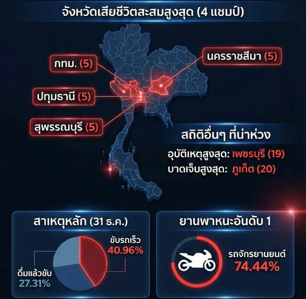 💀 เสียชีวิตสูงสุด (4 จังหวัด) #กรุงเทพมหานคร #นครราชสีมา #ปทุมธานี #สุพรรณบุรี (จังหวัดละ 5 ราย)