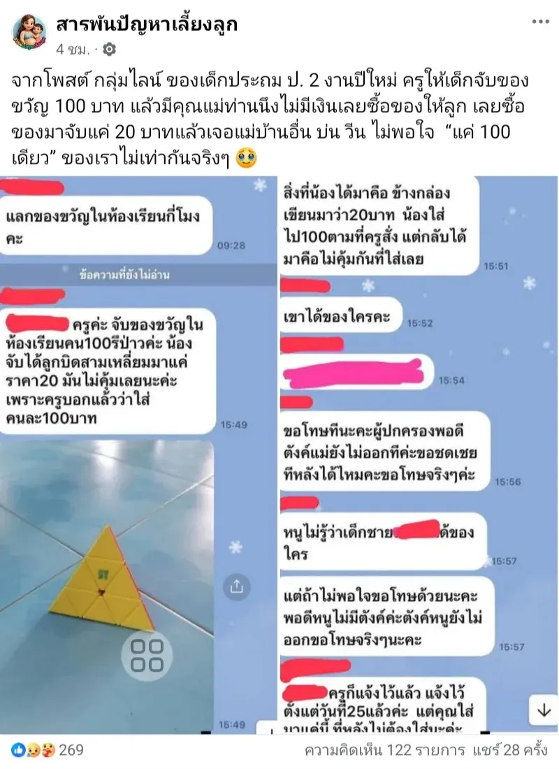 กลายเป็นประเด็นร้อนต้อนรับเปิดเทอม เมื่อผู้ปกครองท่านหนึ่งออกมาโพสต์ระบายความอัดอั้น หลังลูกจับฉลากของขวัญปีใหม่ที่โรงเรียน โดยมีกติกาชัดเจนว่า "ของขวัญขั้นต่ำ 100 บาท"