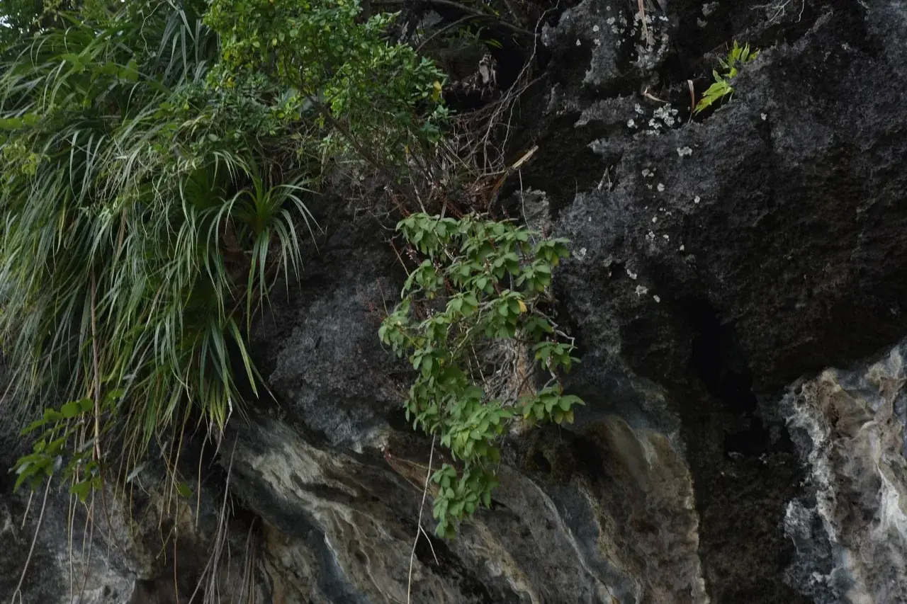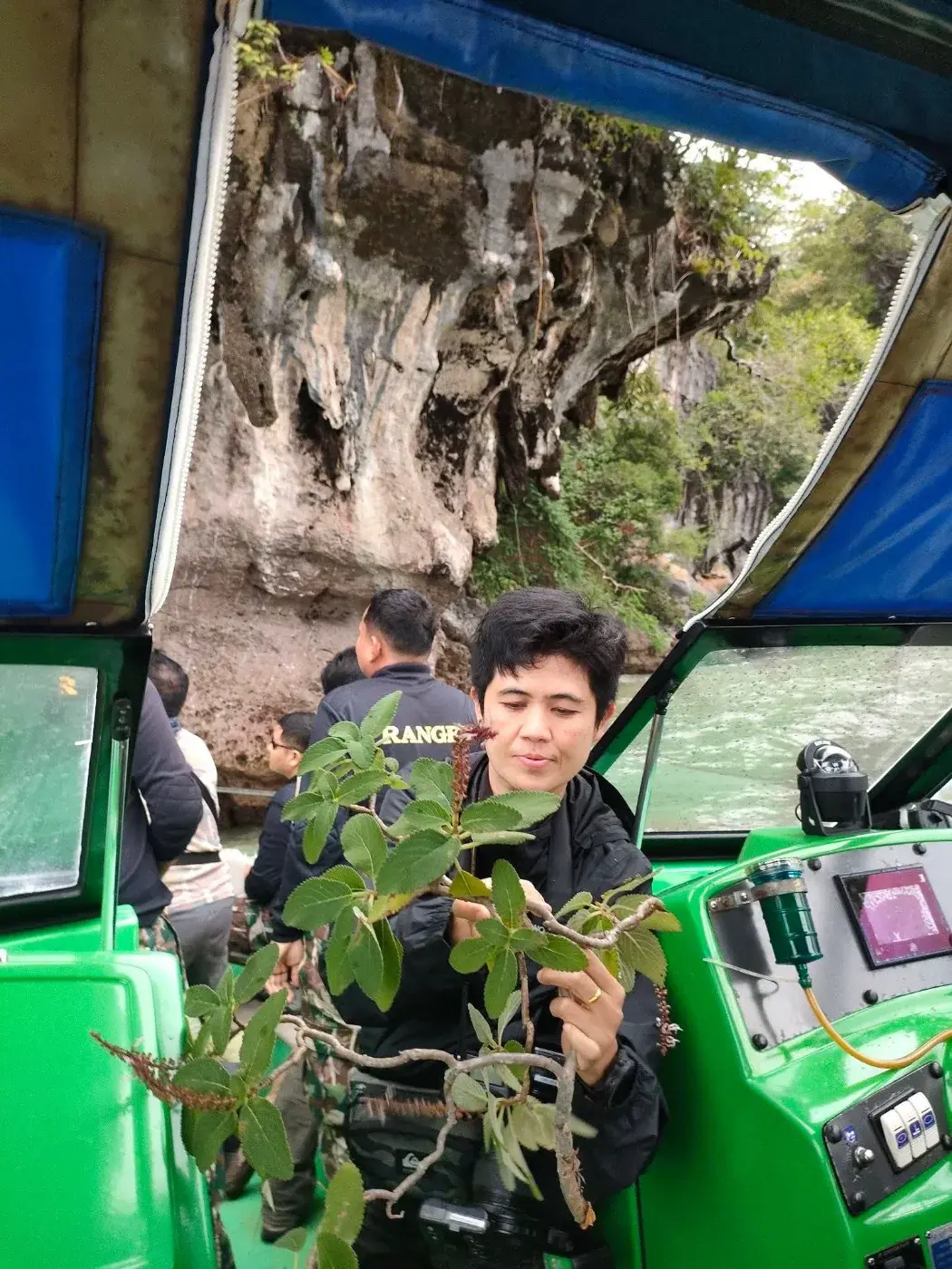 แล้วก็ไปเจอพืชพุ่มเล็ก ๆ เกาะอยู่ตามซอกหน้าผาหินปูน สูงจนปีนขึ้นไปไม่ได้ทาง ทีมงานต้องใช้ไม้สอยเก็บตัวอย่างลงมาตรวจสอบ