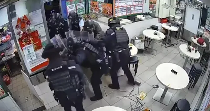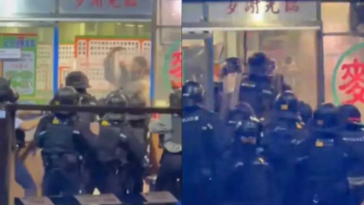 หญิงจีนก่อเหตุวุ่นวายในร้านก๋วยเตี๋ยวฮ่องกง โดนตำรวจพร้อมโล่รุมจับคาร้าน