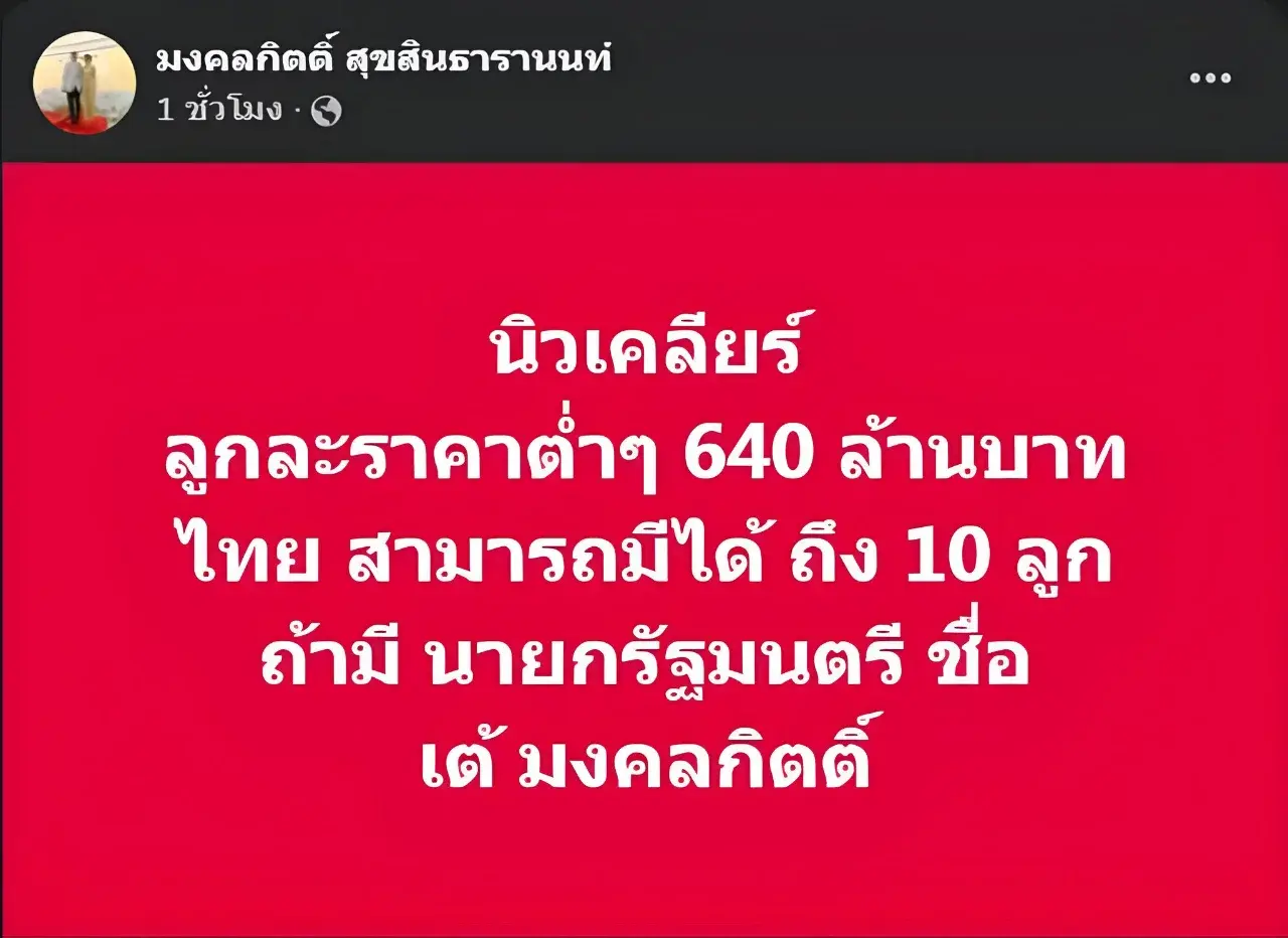 เต้ มงคลกิตติ์ โพสต์ หากเป็นนายกรัฐมนตรีของไทย ไทยมี นิวเคลียร์ ไว้ในการครอบครองไว้ 10 ลูก แน่นอน