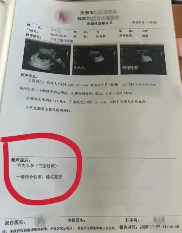 วันที่ 22 พฤศจิกายน 2025 ในการตรวจครรภ์ครั้งที่ 3 ณ โรงพยาบาลเดิม รายงานทางการแพทย์ระบุว่า "พบตัวอ่อน 3 คน ซึ่งทุกคนมีการเต้นของหัวใจ และ ค่าความยาวศีรษะถึงก้นสอดคล้องกับอายุครรภ์ ภายในเวลาเพียงกว่าครึ่งเดือน จำนวนทารกในครรภ์เพิ่มจาก 1 เป็น 3 ทำให้เธอทั้งดีใจและกังวลใจในเวลาเดียวกัน