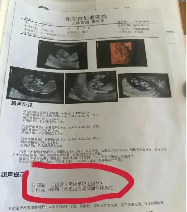 เพื่อความแน่ชัด วันที่ 15 ธันวาคม 2025 "หวัง" จึงตัดสินใจเข้ารับการตรวจที่โรงพยาบาลสตรีและเด็ก ในเมืองเสิ่นหยาง ซึ่งเป็นสถานพยาบาลขนาดใหญ่กว่า โดยผลอัลตราซาวด์ครั้งนี้เกินความคาดหมายของเธออย่างมาก เมื่อแพทย์ยืนยันว่ามีทารกในครรภ์ถึง 4 คน ยังมีชีวิตทั้งหมด และ เป็นแฝดสี่ไข่ใบเดียว ใช้รกเดียวกัน ซึ่งเป็นกรณีที่พบได้ยากอย่างยิ่ง ในการตั้งครรภ์ตามธรรมชาติ