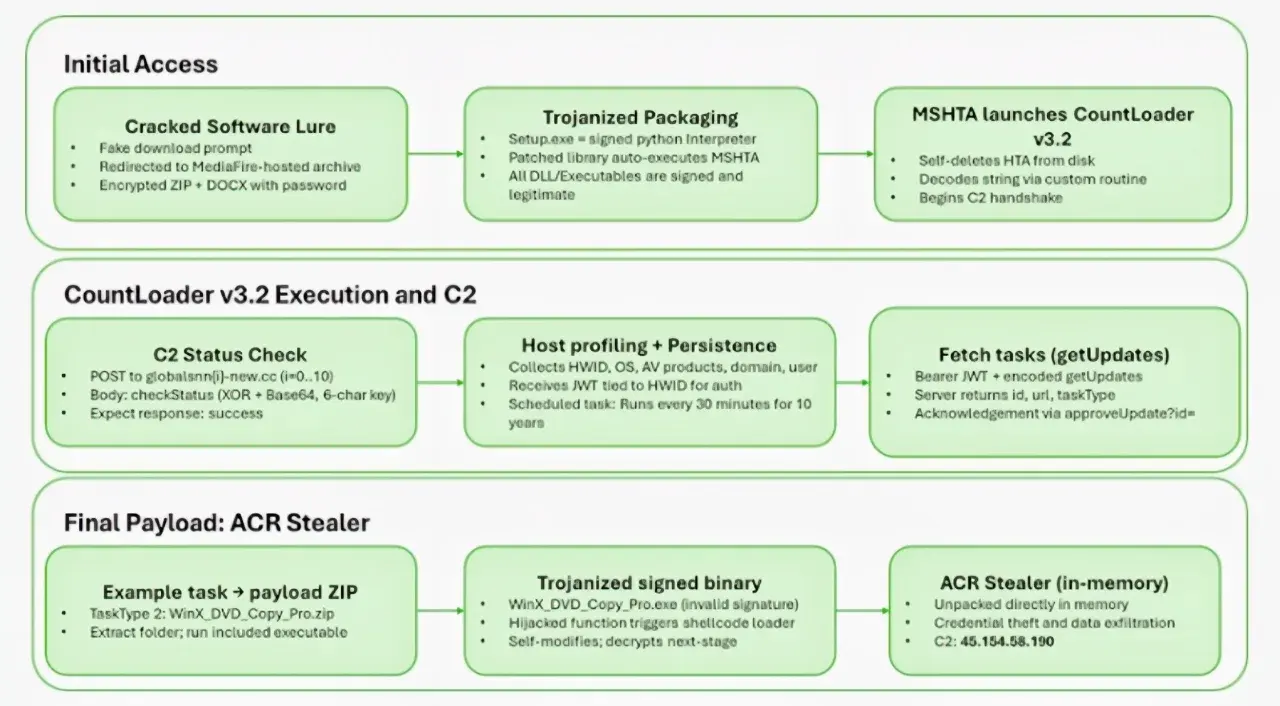 จากรายงานโดยเว็บไซต์ The Hacker News กล่าวถึงการตรวจพบแคมเปญในการแพร่กระจายมัลแวร์นกต่อ (Loader) ที่มีความสามารถในการล่องหนอยู่ภายในระบบของเหยื่อ (Stealth) ที่มีชื่อว่า CountLoader ผ่านทางซอฟต์แวร์เถื่อน ซึ่งมัลแวร์นกต่อตัวนี้มีความสามารถในการปล่อยมัลแวร์หลากหลายชนิดลงบนเครื่องของเหยื่อ เช่น Cobalt Strike, AdaptixC2, PureHVNC RAT, Amatera Stealer และ PureMiner โดยมัลแวร์ Loader ตัวนี้ถูกตรวจพบครั้งแรกในช่วงเดือนมิถุนายนที่ผ่านมา