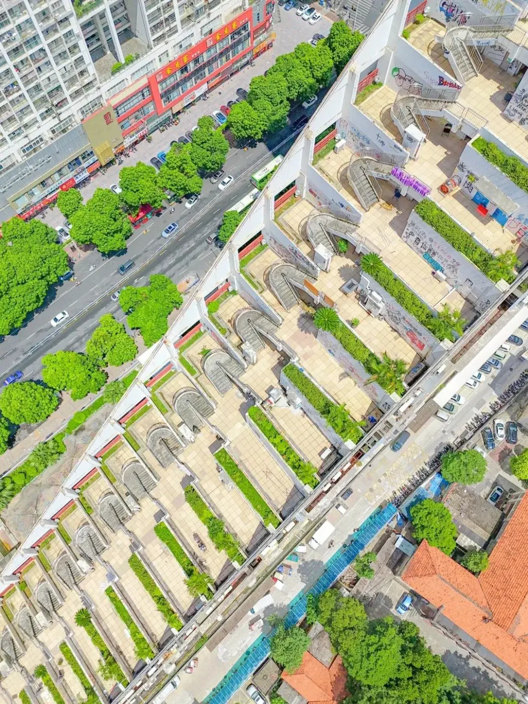 อาคารดังกล่าวมีชื่อว่า "จัตุรัสหัวซิงไทมส์" เป็นอาคารสูง 25 ชั้น ที่ผสมผสานการใช้งานทั้งเชิงพาณิชย์และที่พักอาศัย ส่วนล่างเป็นศูนย์การค้า ในขณะที่ชั้นบนเป็นอพาร์ตเมนต์และสำนักงาน สิ่งที่ทำให้อาคารแห่งนี้ มีชื่อเสียงคือการออกแบบที่แปลกใหม่ โดยด้านหนึ่งของอาคารถูกสร้างเป็นขั้นบันไดกลางแจ้ง แต่ละชั้นมีทางเดินบันไดของตนเอง พร้อมพื้นที่ลานเปิดโล่ง