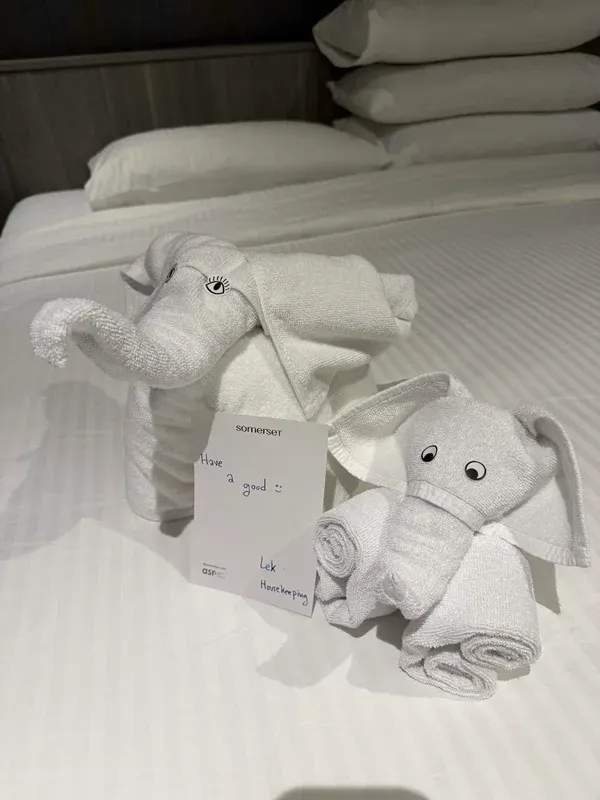 คุณ yanfu.l ถึงกับถ่ายรูปโพสท์ลงโซเชียล กับภาพประทับใจในห้องพัก เมื่อเจ้าตัวชอบใจที่โรงแรมไทยสามารถพับผ้าขนหนูเป็นรูปช้างได้จริง ก็เลยรีเควสต์ขอพนักงานให้พับเป็นรูปสัตว์อื่นอีก