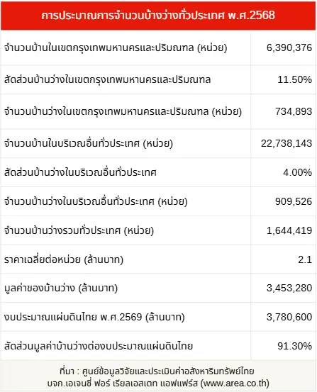 ศูนย์ข้อมูลวิจัยและประเมินค่าอสังหาริมทรัพย์ไทย ได้สำรวจบ้านว่างหรือที่อยู่อาศัยที่สร้างเสร็จแต่ไม่มีผู้เข้าอยู่อาศัยตั้งแต่ปี 2538 และในปี 2541 พบบ้านว่างประมาณ 350,000 หน่วย และบ้านว่างก็เพิ่มปริมาณขึ้นอย่างต่อเนื่อง ล่าสุดจากจำนวนบ้านในเขตกรุงเทพมหานครและปริมณฑลที่มีอยู่ 6,390,376 หน่วย ประมาณว่าเป็นบ้านว่าง 734,893 หน่วย ส่วนจำนวนบ้านในบริเวณอื่นทั่วประเทศ มี 22,738,143 หน่วย คาดว่ามีสัดส่วนบ้านว่างในบริเวณอื่นทั่วประเทศ 4.0% ดังนั้นจำนวนบ้านว่างในบริเวณอื่นทั่วประเทศจึงควรเป็น 909,526 หน่วย รวมทั่วประเทศก็คือ 1,644,419 หน่วย หากประมาณการว่าราคาเฉลี่ยต่อหน่วยคือ 2.1 ล้านบาท ทำให้มูลค่าของบ้านว่างเป็นเงินถึง 3,453,280 ล้านบาท ซึ่งเกือบเท่า (หรือ 91.3%) ของงบประมาณแผ่นดิน พ.ศ.2569 (3,780,600 ล้านบาท)