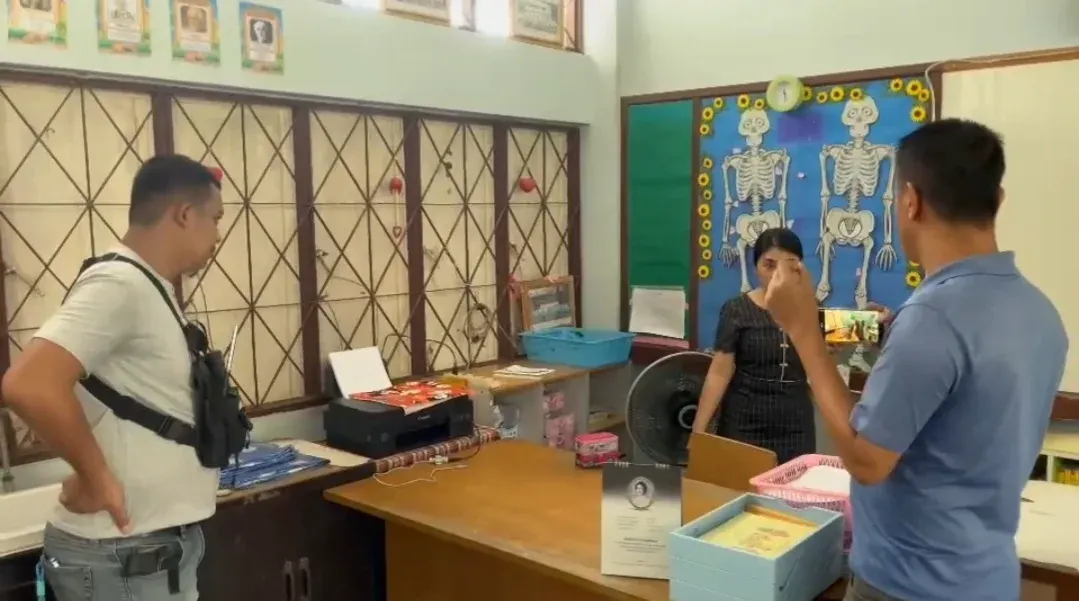 เมื่อถึงที่เกิดเหตุพบผู้อำนวยการโรงเรียน ครู และภารโรง ยืนรออยู่ในโรงเรียน ก่อนพาตำรวจเข้าไปตรวจสอบที่ห้องพักครู และห้องเรียนภายในอาคาร พบว่าแม่กุญแจถูกตัดเสียหาย หลายจุด ส่วนในห้องพักครู มีโน็ตบุ๊ค 2 เครื่อง รวมราคาประมาณ 50,000 บาท ,สายชาร์จโทรศัพท์ และเงินขอครูและนักเรียนจำนวนหนึ่งถูกคนร้ายขโมยไป จึงถ่ายภาพที่เกิดเหตุอย่างละเอียด ตรวจสอบกล้องวงจรปิดในโรงเรียน พร้อมกับประสานตำรวจพิสูจน์หลักฐานเข้าเก็บรอยนิ้วมือแฝงคนร้าย เพื่อติดตามตัวมาดำเนินคดี