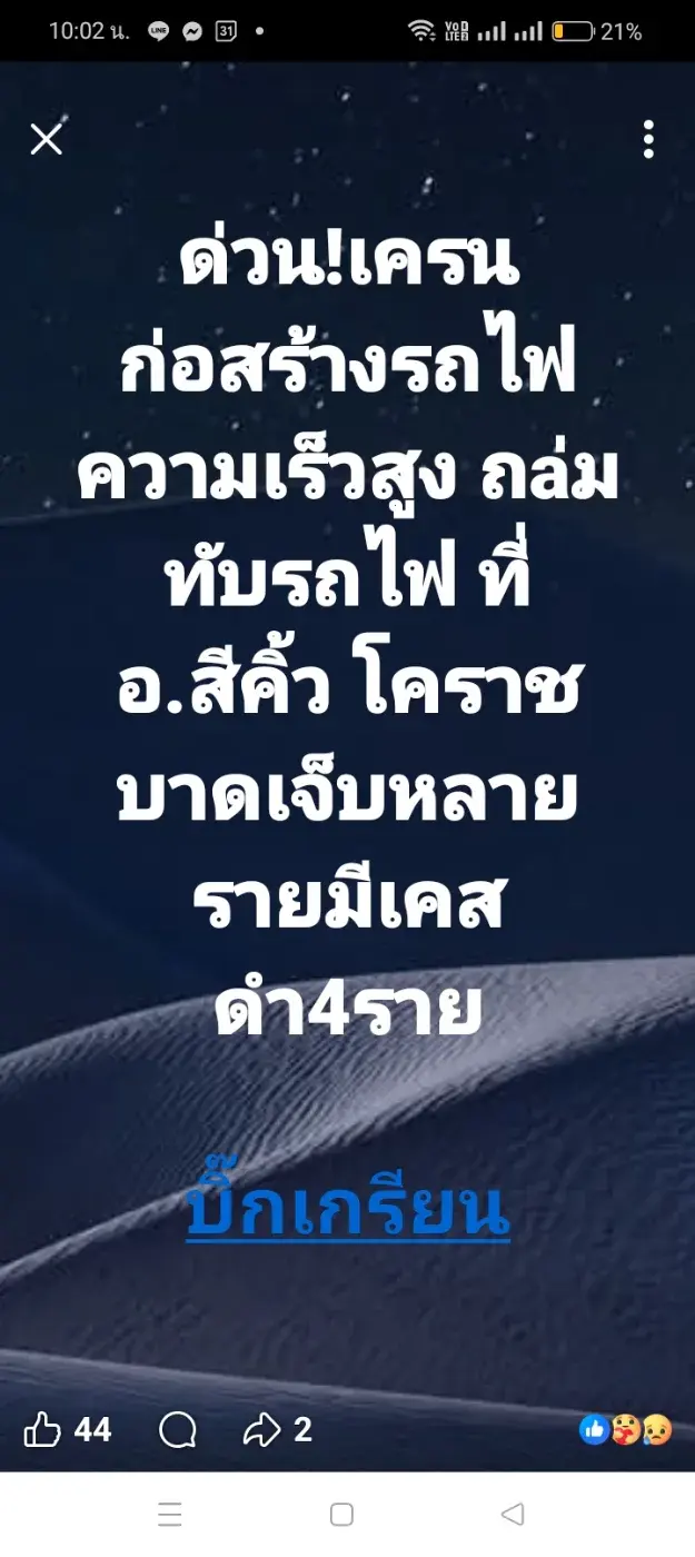 เหตุการณ์อุบัติเหตุรุนแรงที่เกิดขึ้นในพื้นที่จังหวัดนครราชสีมาสร้างความตระหนกให้แก่ประชาชนเป็นอย่างมาก เมื่อโครงสร้างเครนก่อสร้างรถไฟความเร็วสูงพังถล่มลงมาทับขบวนรถไฟอย่างจัง ท่ามกลางสภาพภูมิประเทศที่เกิดดินสไลด์ซ้ำเติมในจุดเกิดเหตุ ส่งผลให้มีผู้บาดเจ็บหลายรายและต้องเร่งระดมเจ้าหน้าที่เข้าช่วยเหลือโดยด่วน