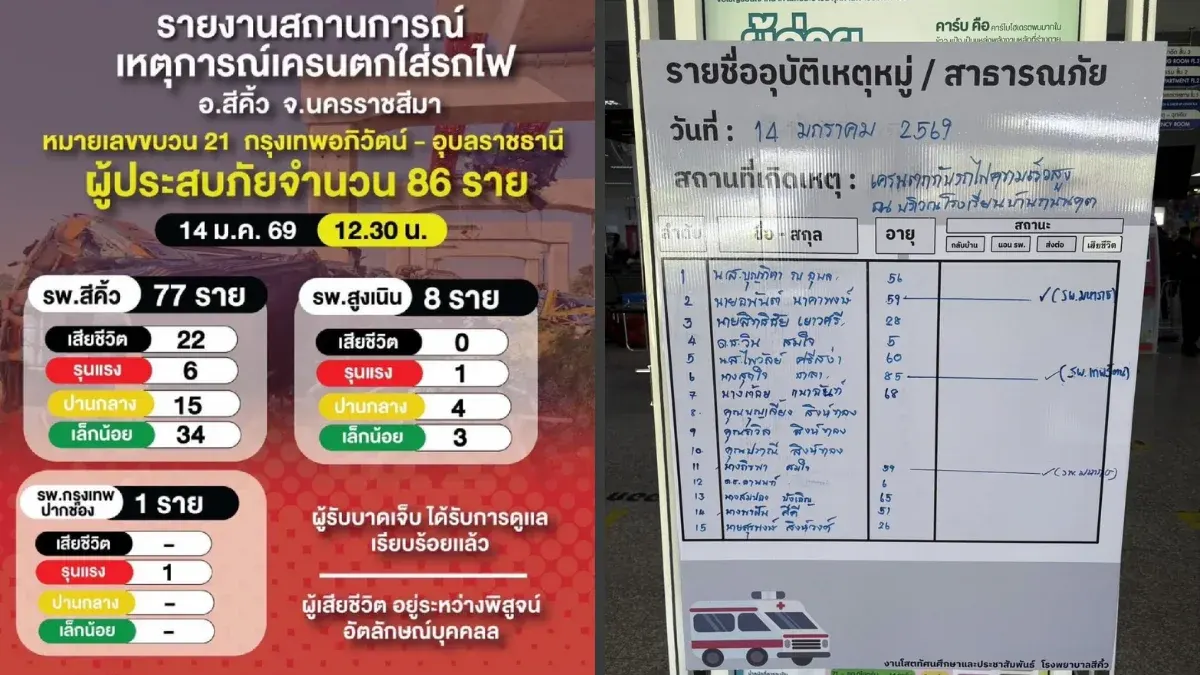 ตรวจสอบรายชื่อ ผู้ได้รับบาดเจ็บและผู้เสียชีวิต เหตุเครนหล่นทับรถไฟ