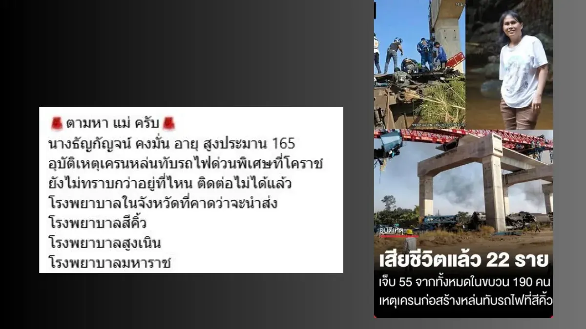 เมื่อวันที่ 14 มกราคม 2569 โลกออนไลน์ได้ช่วยกันแชร์โพสต์ของผู้ใช้เฟซบุ๊ก "N’aramet Tom" ที่ประกาศตามหาคุณแม่ คือ นางธัญกัญจน์ อายุ 57 ปี ซึ่งเดินทางไปกับขบวนรถด่วนพิเศษที่ 21 มุ่งหน้าจังหวัดอุบลราชธานีเพื่อไปทำบุญให้หลานที่ป่วย แต่หลังจากเกิดเหตุเครนก่อสร้างถล่มทับรถไฟ ครอบครัวกลับไม่สามารถติดต่อคุณแม่ได้ สร้างความกังวลใจเป็นอย่างมากเนื่องจากทราบข้อมูลภายหลังว่า คุณแม่ได้ย้ายที่นั่งจากตู้แรกไปอยู่ที่ตู้ที่ 2 เนื่องจากตู้แรกมีอากาศเย็นเกินไป ซึ่งตู้ที่ 2 นั้นเป็นจุดที่ได้รับแรงกระแทกจากเครนโดยตรง