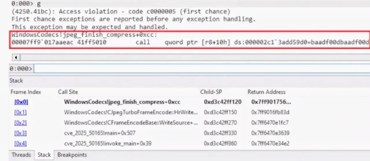 จากรายงานโดยเว็บไซต์ Cyber Security News ได้กล่าวถึงการตรวจพบช่องโหว่ความปลอดภัยในส่วนของ Windows Imaging Component ซึ่งเป็น Library ภายในของ Windows ที่ใช้ในการประมวลผลรูปภาพตัวหนึ่งที่มีชื่อว่า WindowsCodecs.dll ในรุ่น 10.0.26100.0 ถึง 10.0.26100.4945 โดยไฟล์นี้จะถูกใช้งานการประมวลไฟล์รูปภาพแบบพื้นฐานต่าง ๆ เช่น JPEG, PNG, GIF, และ BMP ช่องโหว่ดังกล่าวนั้นมีรหัสว่า CVE-2025-50165 ซึ่งช่องโหว่นี้มีคะแนนความร้ายแรง หรือ CVSS Score ที่สูงถึง 9.8 หรือ ร้ายแรงมาก สำหรับช่องโหว่นี้จะเป็นช่องโหว่ประเภท Uninitialized Function Pointer Dereference ซึ่งอธิบายอย่างง่าย ๆ คือ เป็นช่องโหว่ที่ตัวโปรแกรมนั้นเรียกใช้งานฟังก์ชัน ด้วยการใช้งาน Pointer (ตัวชี้เป้า) ที่ยังไม่ถูกกำหนดที่อยู่ของหน่วยความจำ (Memory Address) ที่ถูกต้อง จนทำให้ถูกยกเลิกการเรียกใช้งาน (Uninitilized) นำไปสู่อาการค้างจากการทำงานผิดพลาดและทำให้แฮกเกอร์แทรกแซงโค้ดโดยไม่ได้รับอนุญาตได้ ซึ่งช่องโหว่นี้จะเปิดขึ้นในระหว่างการประมวล หรือ บีบอัดไฟล์ตระกูล JPEG ที่มีความลึกของสี (Color Depth) ในระดับ 12 บิต และ 16 บิต