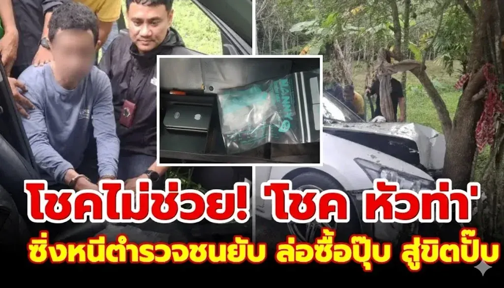 ตำรวจล่อซื้อ “ โชค หัวท่า “ เอเย่นต์ยานรก ซิ่งเก๋งหนีเสียหลักชนต้นไม้พังยับ