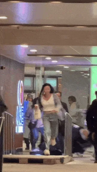 ภาพจากกล้องวงจรปิดแสดงให้เห็นประชาชนจำนวนมาก แตกตื่นวิ่งหนีตายออกไปยังถนน ชายผู้ก่อเหตุซึ่งสวมเสื้อสีขาวและสะพายเป้ ถูกบันทึกภาพขณะวิ่งออกจากห้าง โดยใช้สายกระเป๋าจับยึดตัวประกันไว้