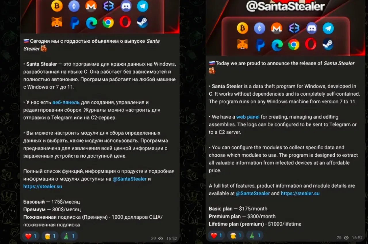 จากรายงานโดยเว็บไซต์ Techi ได้กล่าวถึงการที่ทีมวิจัยจาก Rapid 7บริษัทผู้เชี่ยวชาญด้านความปลอดภัยไซเบอร์ตรวจพบแคมเปญการแพร่กระจายมัลแวร์ตัวใหม่ SantaStealer ที่มุ่งเน้นกลุ่มผู้ใช้งานระบบปฏิบัติการ Windows โดยเฉพาะ ซึ่งการตรวจพบดังกล่าวนั้นเกิดขึ้นครั้งแรกในช่วงตันเดือนธันวาคม ค.ศ. 2025 (พ.ศ. 2568) โดยมัลแวร์ตัวนี้ถูกขายบนตลาดใต้ดินที่อยู่ภายในบริการแชท Telegram และในตลาดมืดของแฮกเกอร์แหล่งอื่น ๆ ในรูปแบบมัลแวร์สำหรับเช่าใช้งาน (MaaS หรือ Malware-as-a-Service) ด้วยราคาเริ่มต้นที่ 175 ดอลลาร์สหรัฐ (5,499.46 บาท) ถึง 300 ดอลลาร์สหรัฐ (9,432 บาท) ต่อเดือน ทางทีมวิจัยคาดหมายว่าแฮกเกอร์ที่อยู่เบื้องหลังมัลแวร์ตัวนี้มีความเป็นไปได้สูงว่าจะเป็นแฮกเกอร์จากประเทศรัสเซีย