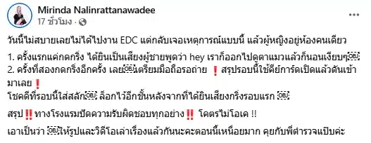 ดีเจสาวเล่าเหตุการณ์ที่ทำให้เธอกลัวการเข้าพักโรงแรมเพียงลำพัง โดยโพสต์คลิปและข้อความผ่านเฟซบุ๊กส่วนตัว ระบุว่าเธอถูกชายปริศนาพยายามเปิดประตูห้องในขณะที่พักอยู่คนเดียว แต่โชคดีที่ล็อกสลักประตูไว้ ทำให้ชายคนนั้นไม่สามารถเข้ามาได้