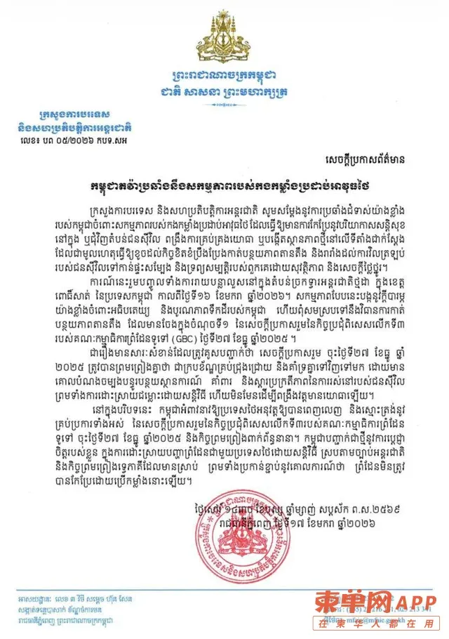 กระทรวงการต่างประเทศกัมพูชา ได้ออกแถลงการณ์อย่างเป็นทางการ แสดงการประท้วงอย่างรุนแรง ต่อการปฏิบัติการของกองทัพไทยในพื้นที่ชายแดน พร้อมกล่าวว่า "เราจะส่งหนังสือทูตประท้วงอย่างเป็นทางการ ไปยังฝ่ายไทยในประเด็นดังกล่าว!!"